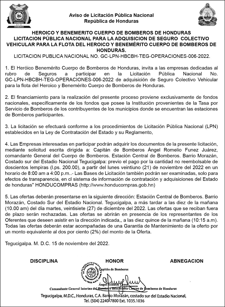 | Objeto | SEGURO COLECTIVO VEHICULAR PARA LA FLOTA DEL HEROICO Y BENEMERITO CUERPO DE BOMBEROS DE HONDURAS |
