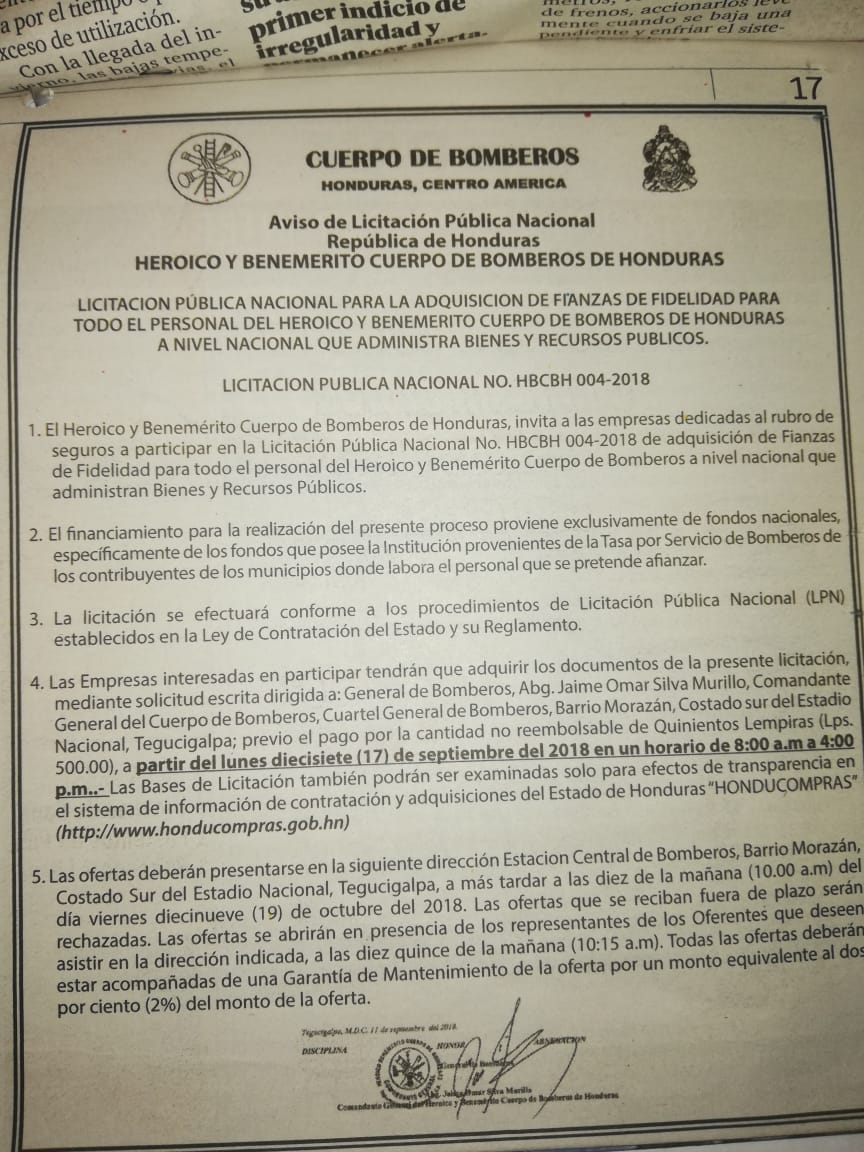 | Lugar Recepción Ofertas | COSTADO SUR DEL ESTADIO NACIONAL CUARTEL GENERAL DEL HEROICO Y BENEMERITO CUERPO DE BPMBEROS DE HONDURAS SALON DE COMANDANTES |