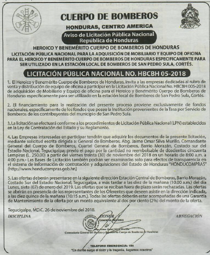 | Objeto | Licitación Publica Nacional para la Adquisición de mobiliario y equipo de oficina para el Cuerpo de de Bomberos en la Estación Local de San Pedro Sula, Cortes |